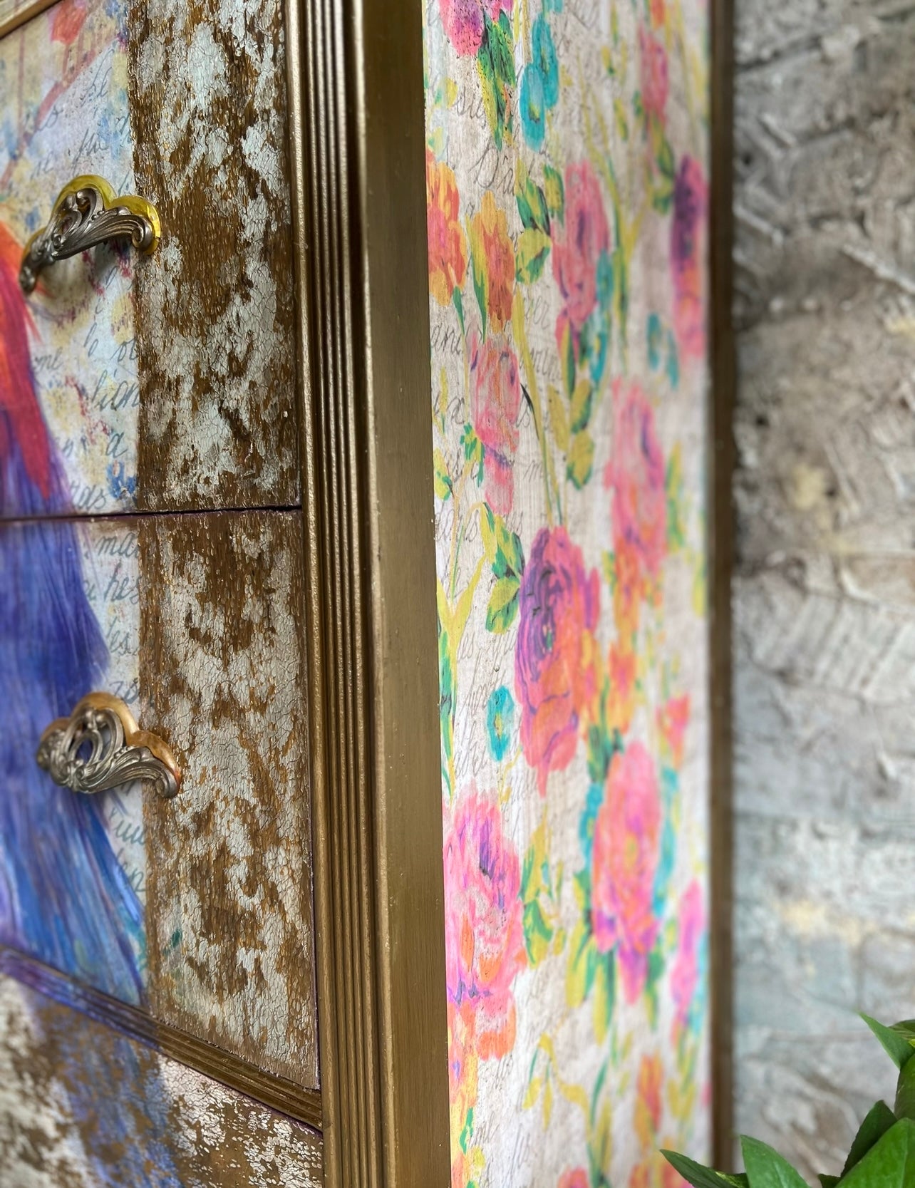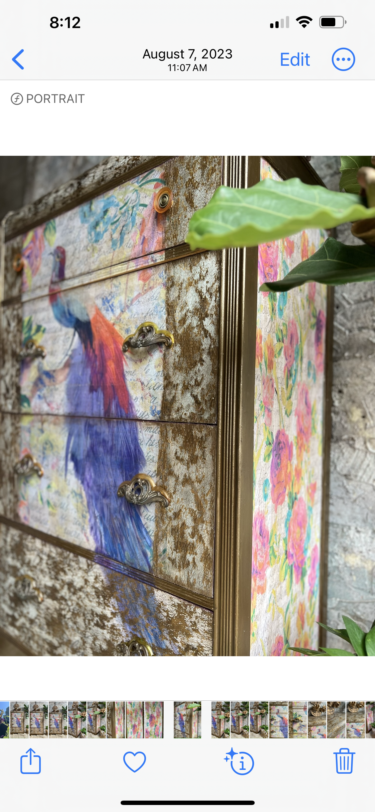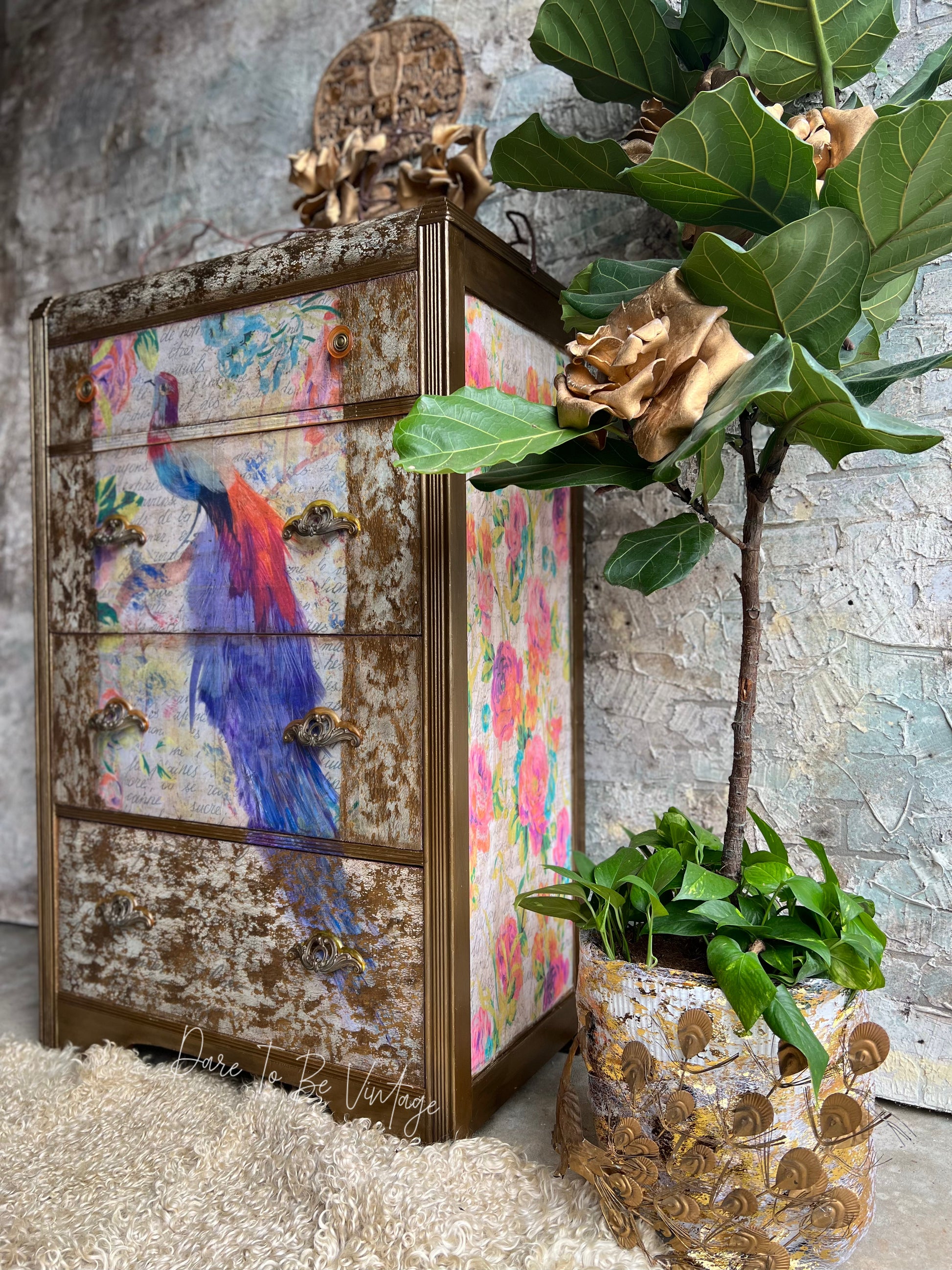 - * PLEASE Note: this piece featured in this listing that created by us. This dresser recommends 1 sheet of 'Bird Of Paradise ' 20 x 30 decoupage paper to allow for full coverage allowing for accented painting. Accented on the sides with 17 x 23 'A Rose Poem.' Decoupage.