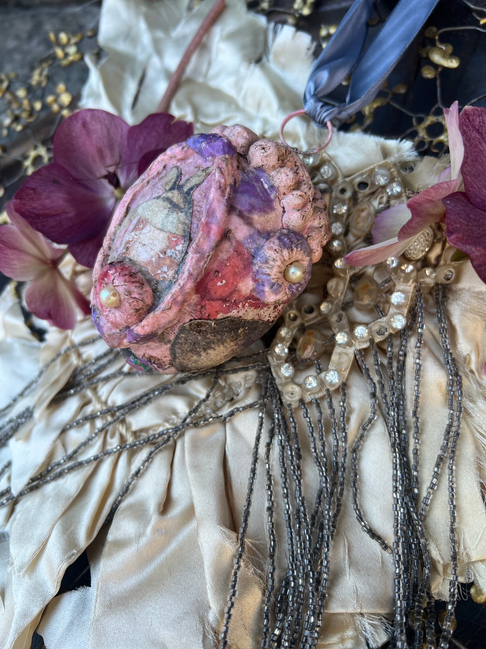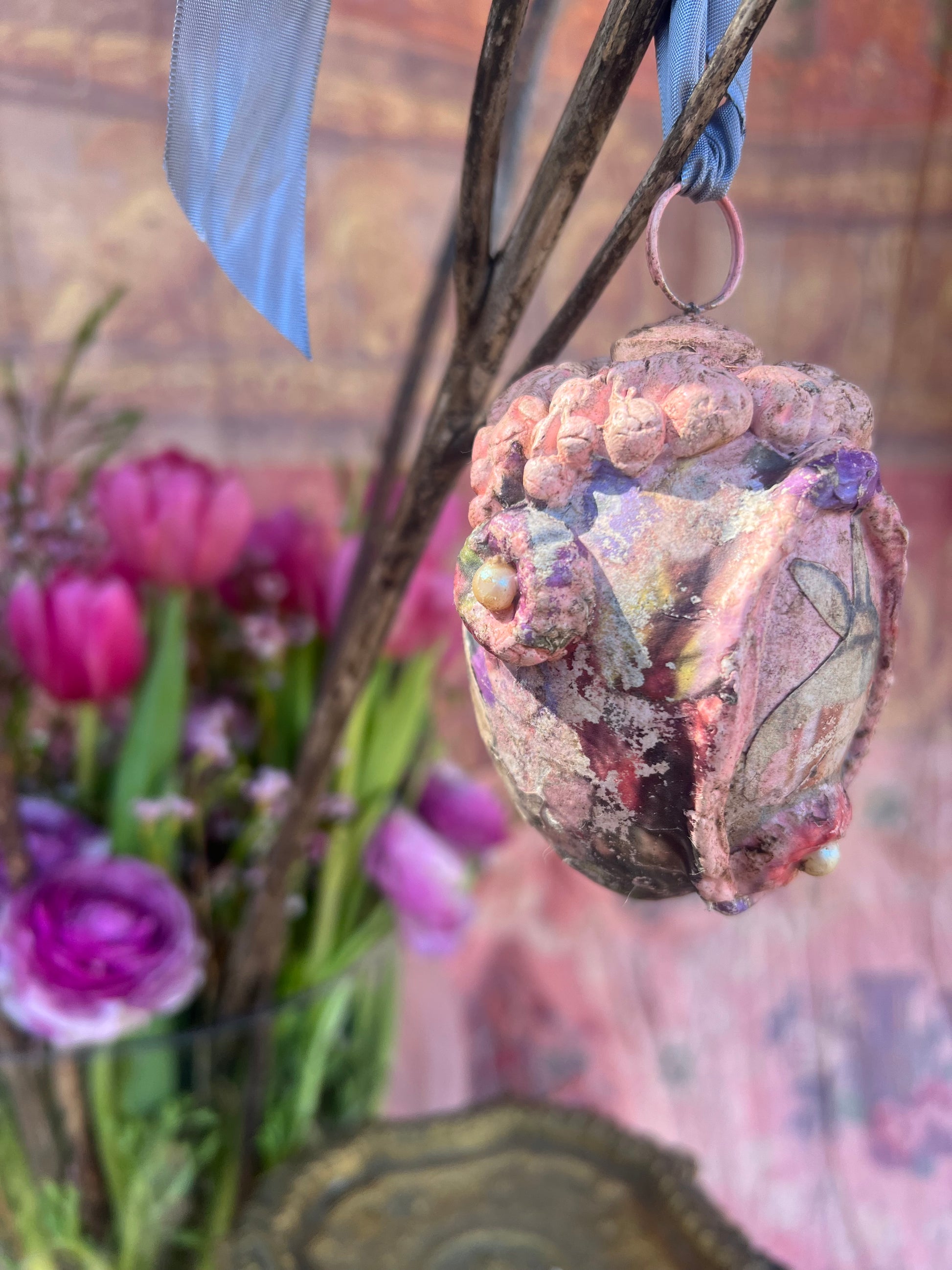 Completely reinventing this egg shaped design into a sweet one of a kind adornment. We have embellished each Easter egg with our exclusive decoupage papers, vintage jewels, and moulds for that unique artsy twist . Accented with a vintage grosgrain ribbon that gives the option to hang them wherever your hearts content. This unique piece can be placed anywhere in the landscape of your home for a year round piece of art. Bring the essence of the garden into your home for that cozy touch. Great table top décor for Easter, Spring or any special occasion. These are created to lend itself to an old rustic time worn feel. Raised textures for that 3D dimension. Please see our other vintage adornments that would compliment this piece beautifully. ***This egg is a heavy resin like material.