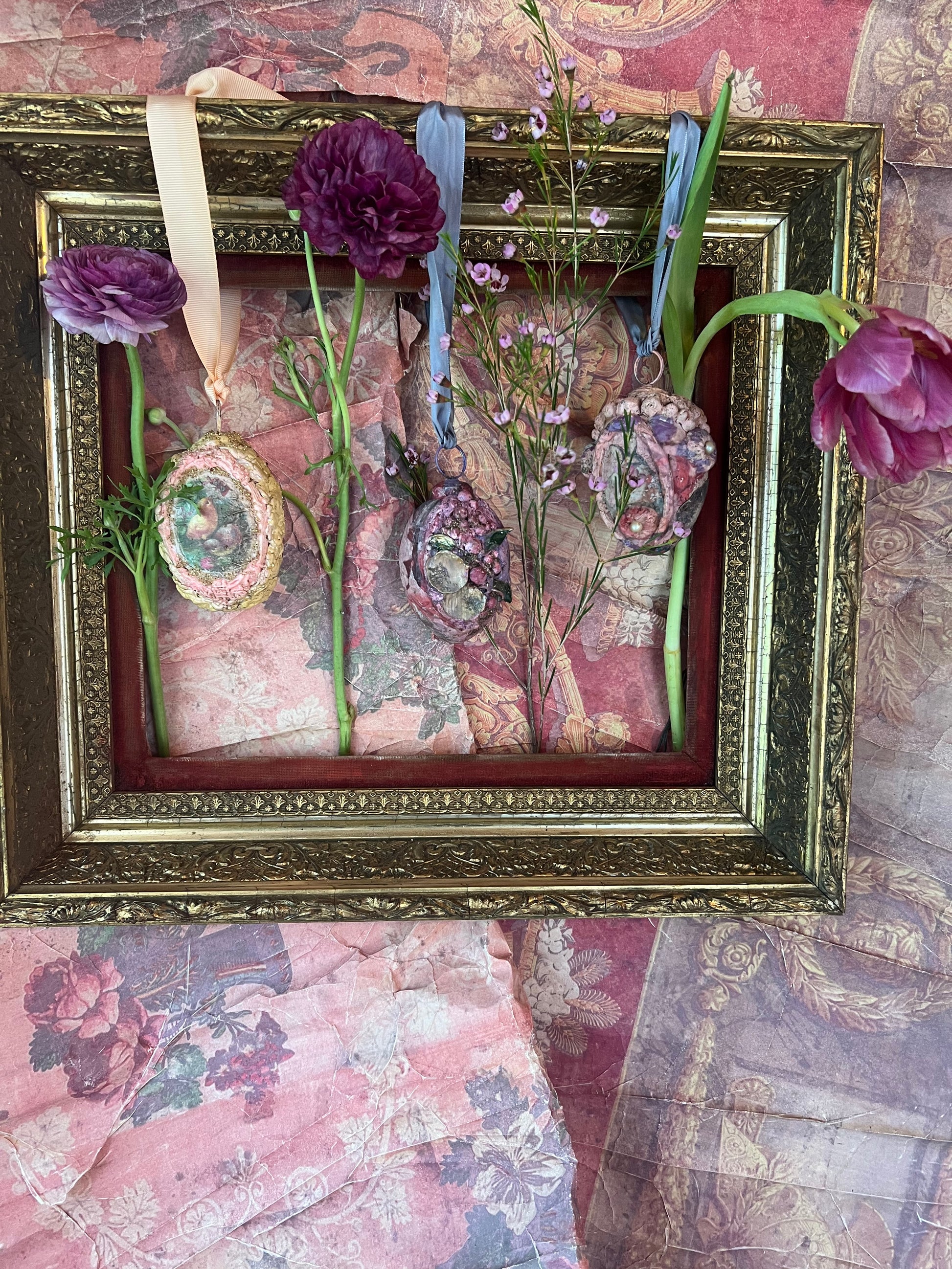 Completely reinventing this egg shaped design into a sweet one of a kind adornment. We have embellished each Easter egg with our exclusive decoupage papers, vintage jewels, and moulds for that unique artsy twist . Accented with a vintage grosgrain ribbon that gives the option to hang them wherever your hearts content. This unique piece can be placed anywhere in the landscape of your home for a year round piece of art. Bring the essence of the garden into your home for that cozy touch. Great table top décor for Easter, Spring or any special occasion. These are created to lend itself to an old rustic time worn feel. Raised textures for that 3D dimension. Please see our other vintage adornments that would compliment this piece beautifully. ***This egg is a heavy resin like material.