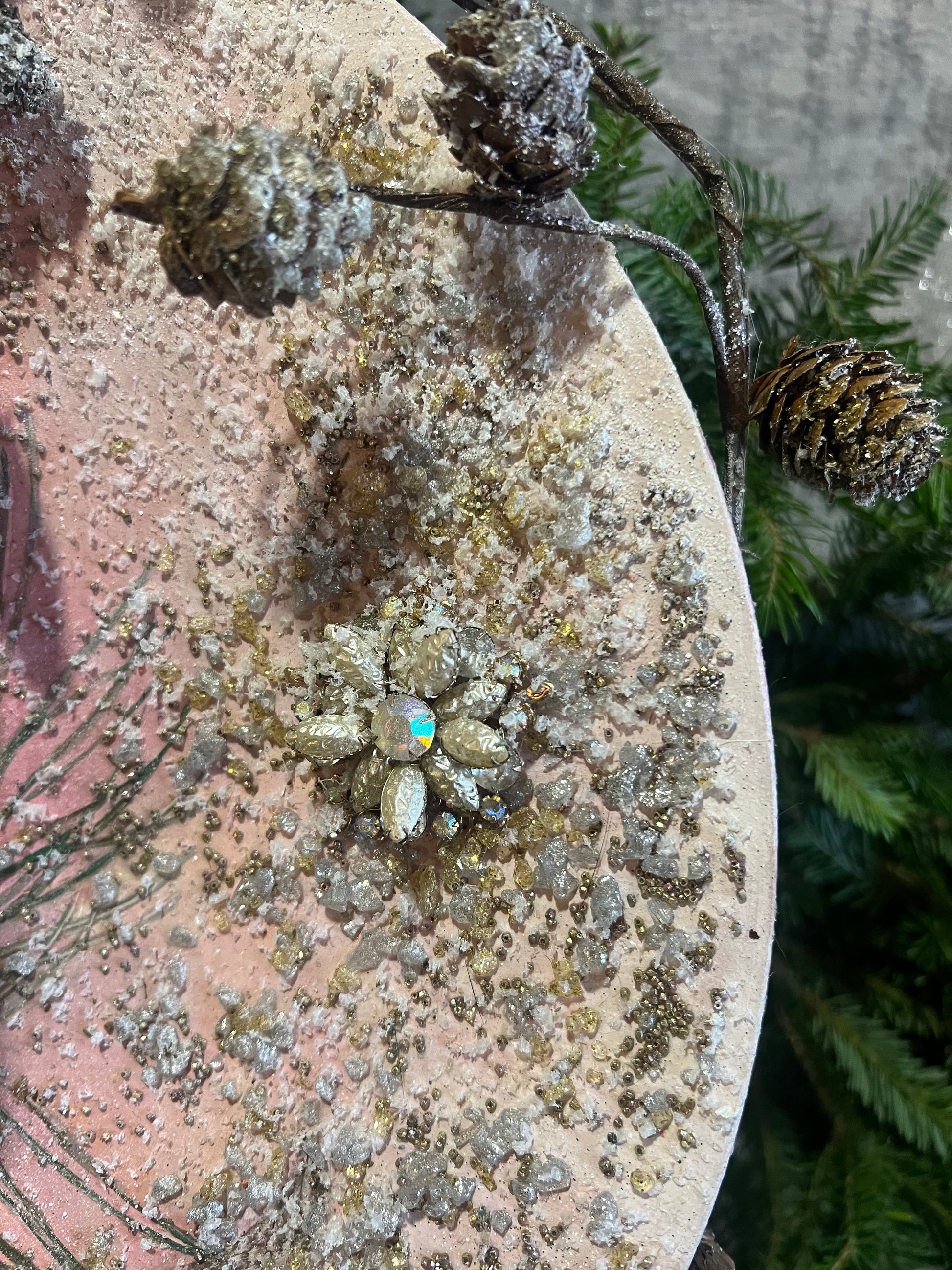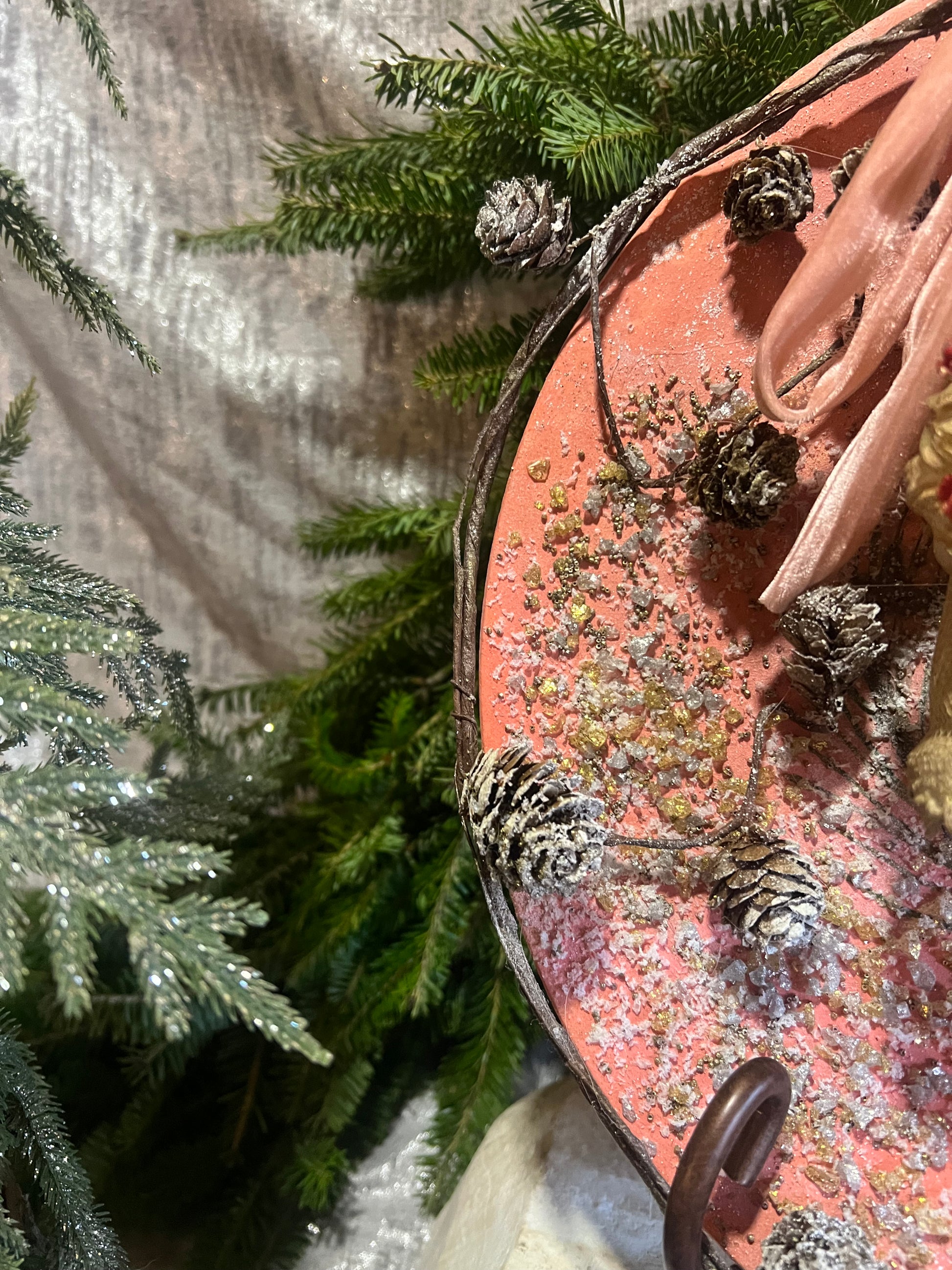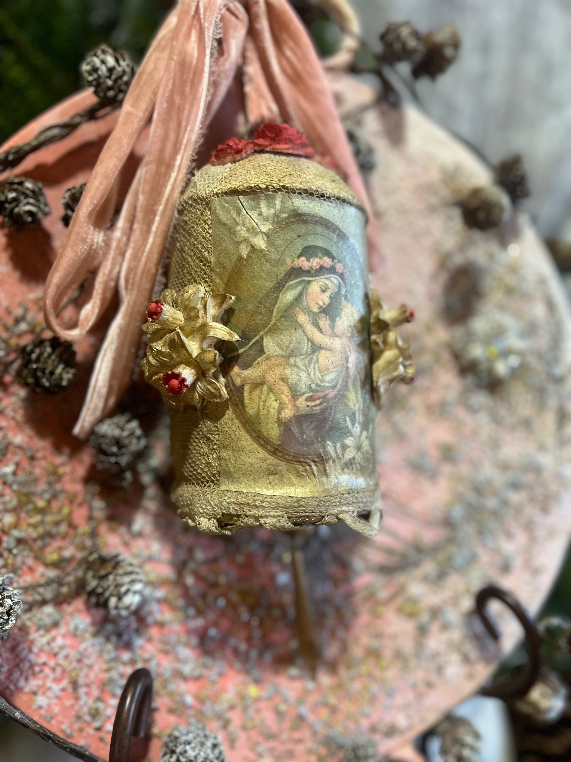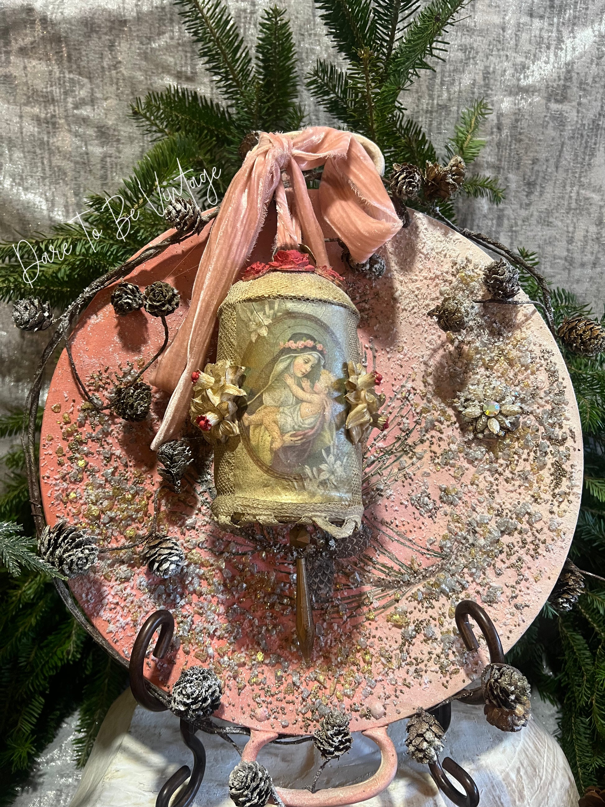 Mother and child are nestled within billowing pine branches that are glistening with freshly fallen snow. This upcycled aluminum tray is dripping in texture and shimmering with gold and silver accents. The decorative handmade bell is embellished with soft pink ribbons and adorned with moulds to give it that old world charm feel. From our vintage collection we c adorned this tray with a beautiful sparkly vintage pin to give that unique one of kind feel. A metal easel was added for ease of placement in your home. Also attached to the ribbon is a moveable vintage hardware element if you would like to hang this piece of art as well. This one of a kind vintage tray will add a touch uniqueness to the interior landscape of your home.