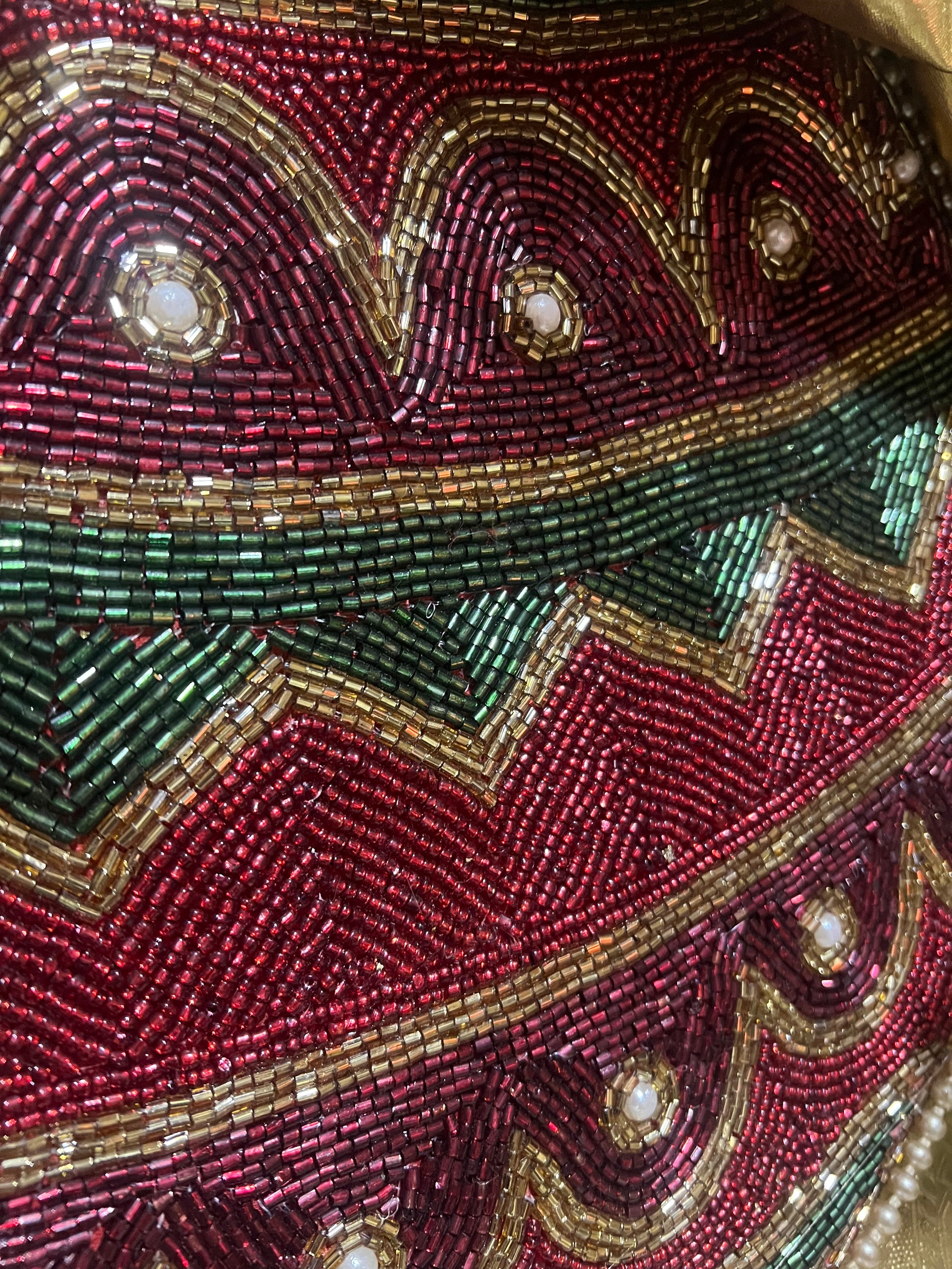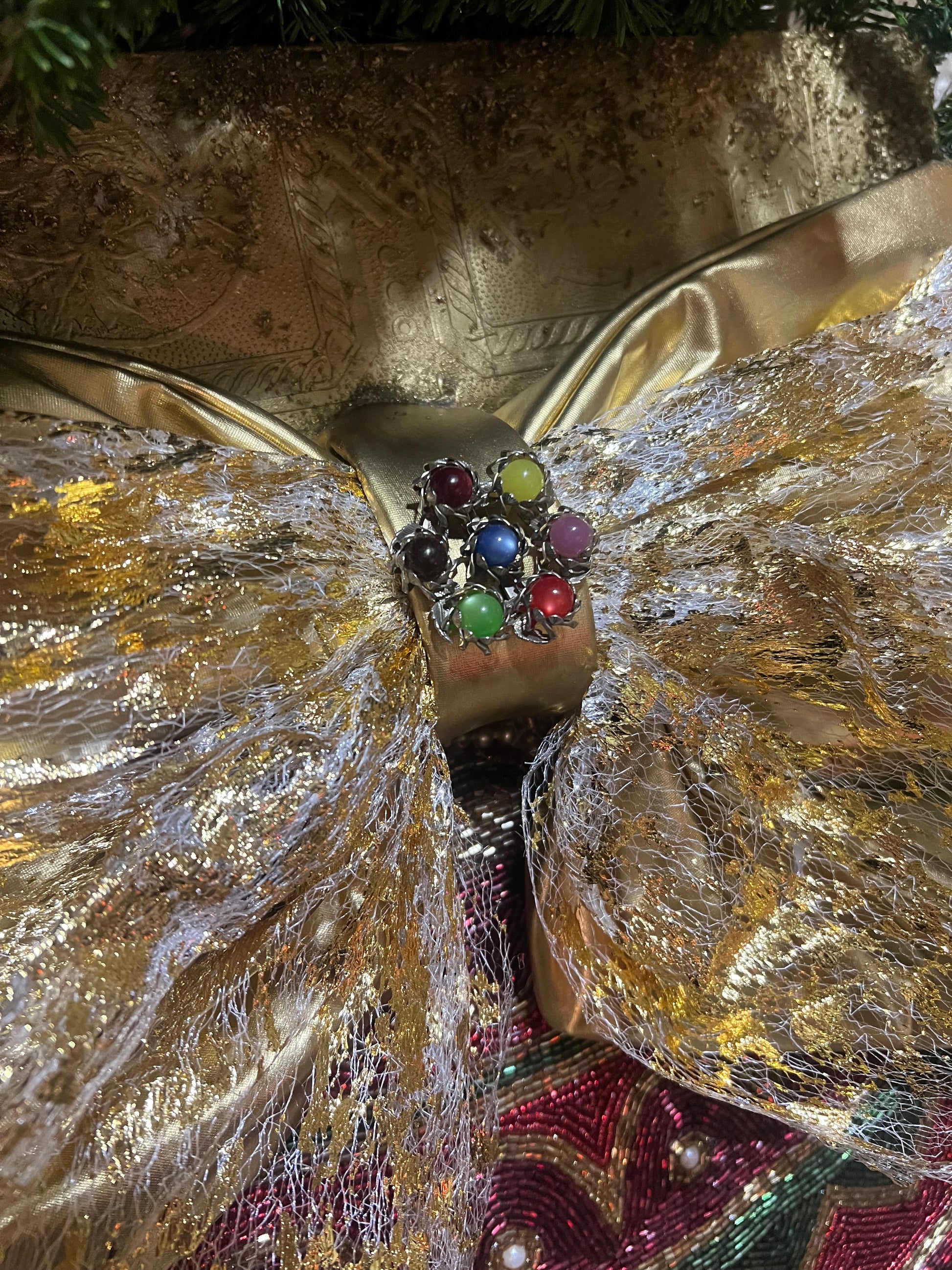 Ring in the holiday spirit with this festive one of a kind show stopper wall art. A dramatic gold bow dressed with a vintage pin and draped with lace netting doesn't stop there. A metallic gold canvas was embellished with gold snowflakes and raised texture that sits upon a glistening beaded ornament that was embellished with a strand of vintage pearls. The bow has depth and is larger in size which makes for a bold statement. This one of a kind piece of art brings that old world charm into your home for the holidays. It can be hung or nestled on a mantle for all to enjoy during the season.