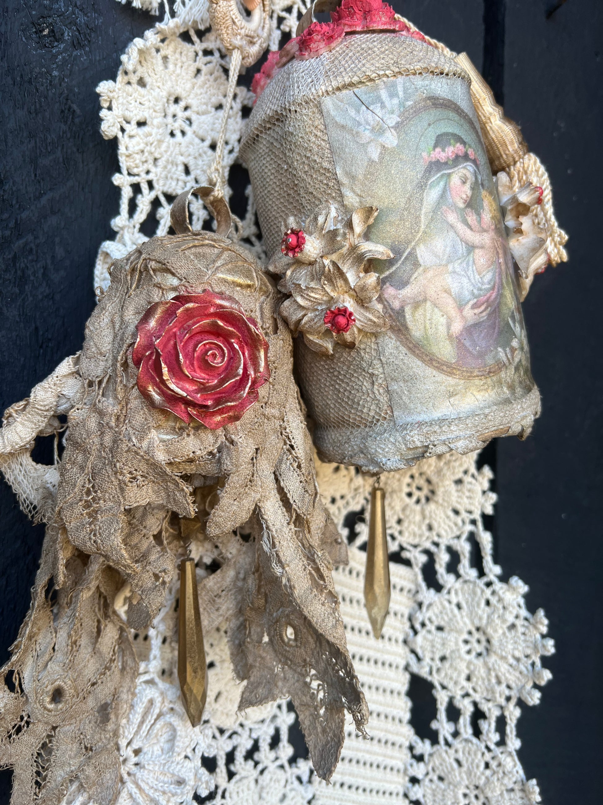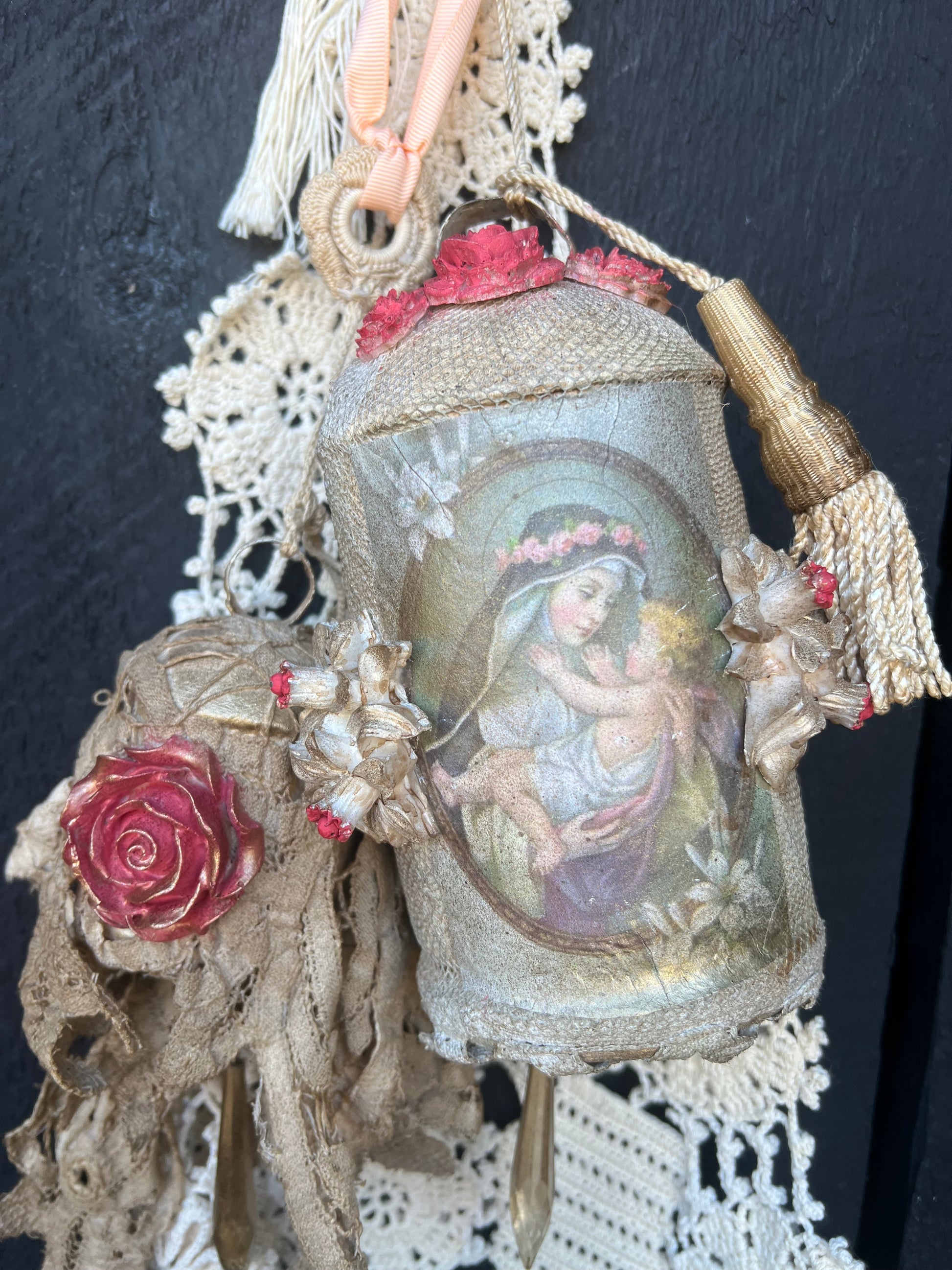These temple bells were completely transformed into one of a kind pieces of art. Adorned with a vintage religious scene , embellished with floral moulds , and draping in vintage lace with vintage accents for that added twist. These can be added to a wreath, a mantle or placed as table setting and so much more.