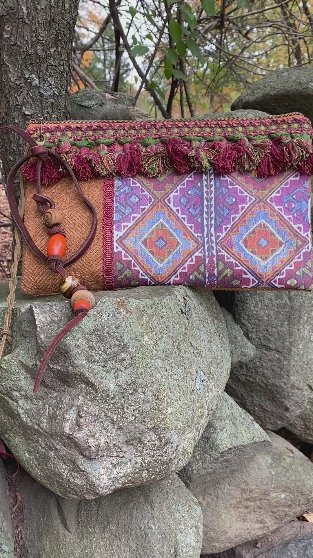 This original Bohemian style clutch pouch was hand designed and made from our personal vintage textile collection. It has been recreated and designed with a time worn fabric canvas , embellished with lush woven tassels intertwined with vintage beads to make this a one of a kind purse that can be used as a wristlet. Inside has a small bag for all your accessories. These unique and stylish handbags were created at our studio, all our vintage elements ,hand picked upholstery and materials were sourced by us for this specialized one of a kind hand bag.