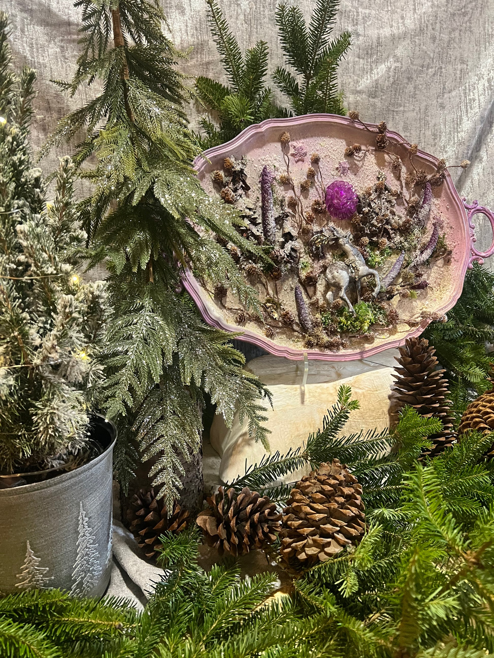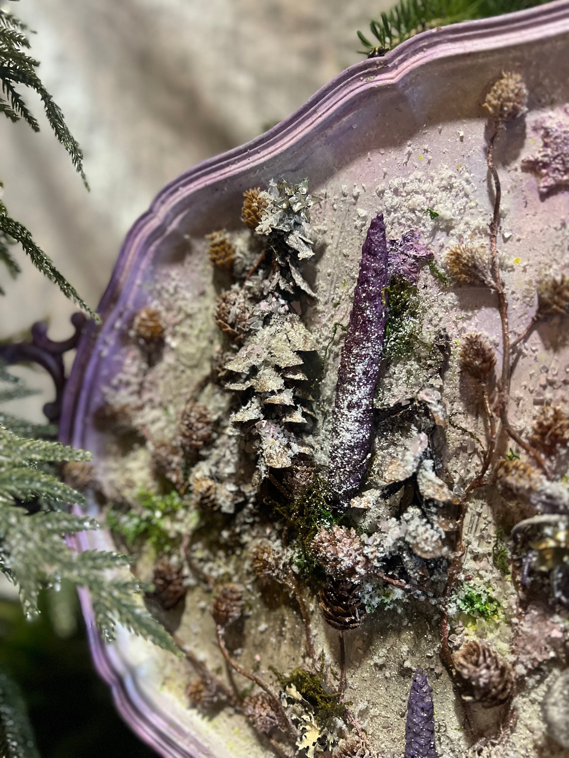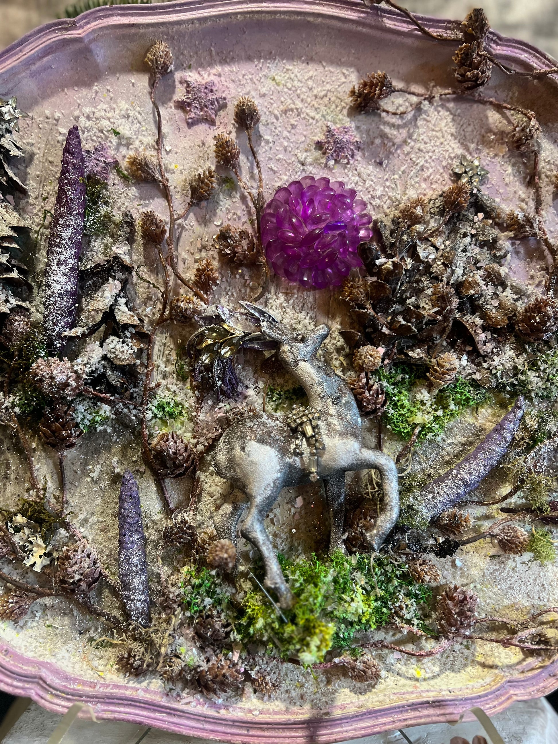This vintage heavy silver plated tray was repurposed using texture to give that 3D design effect. Colorful shades of purples & glistening accents were added to this beautiful vintage tray. Bountiful of Pinecones, moss, and freshly fallen snow. Embellished with bold vintage pins that add to the uniqueness of this tray. One adorns the top of the tree, you can't miss the large purple lucite pin that lights up the tray, and vintage embellishments sits as a headdress of antlers on the dashing reindeer. This one of kind piece of art will add a touch of mother nature to the interior landscape of your home. This decorative tray can be placed anywhere in your home. This tray is accompanied by a vintage lucite picture frame holder for ease of placement. This tray can be hung on a wall for another option (backing not provided).