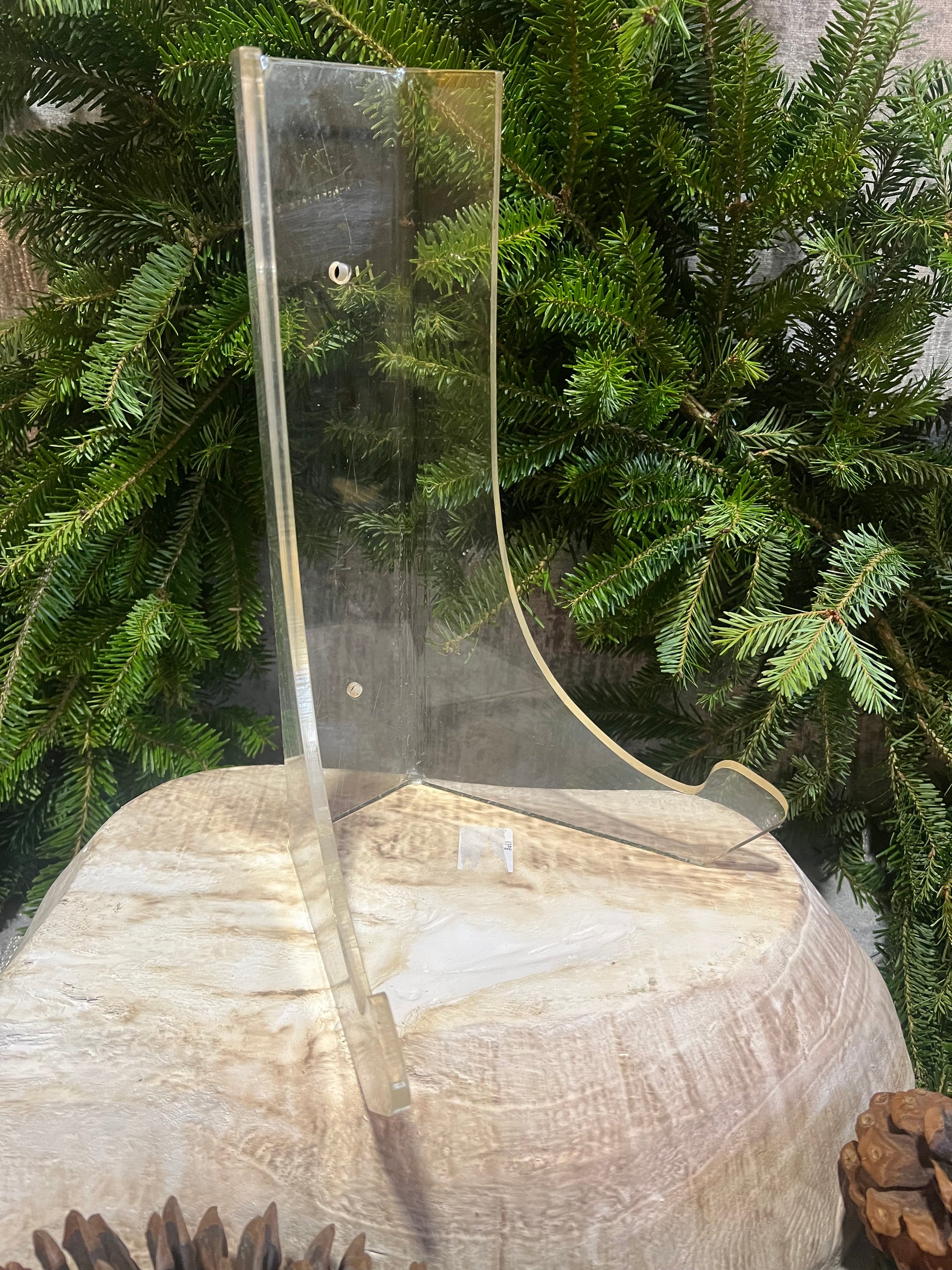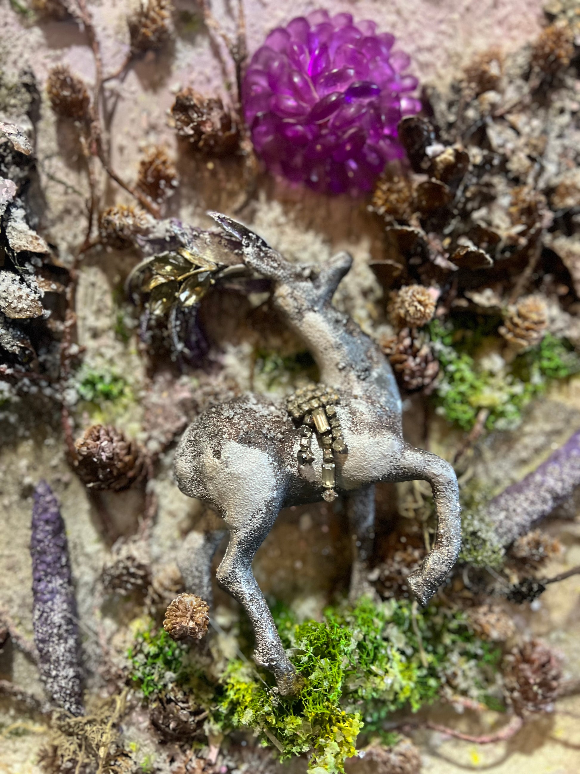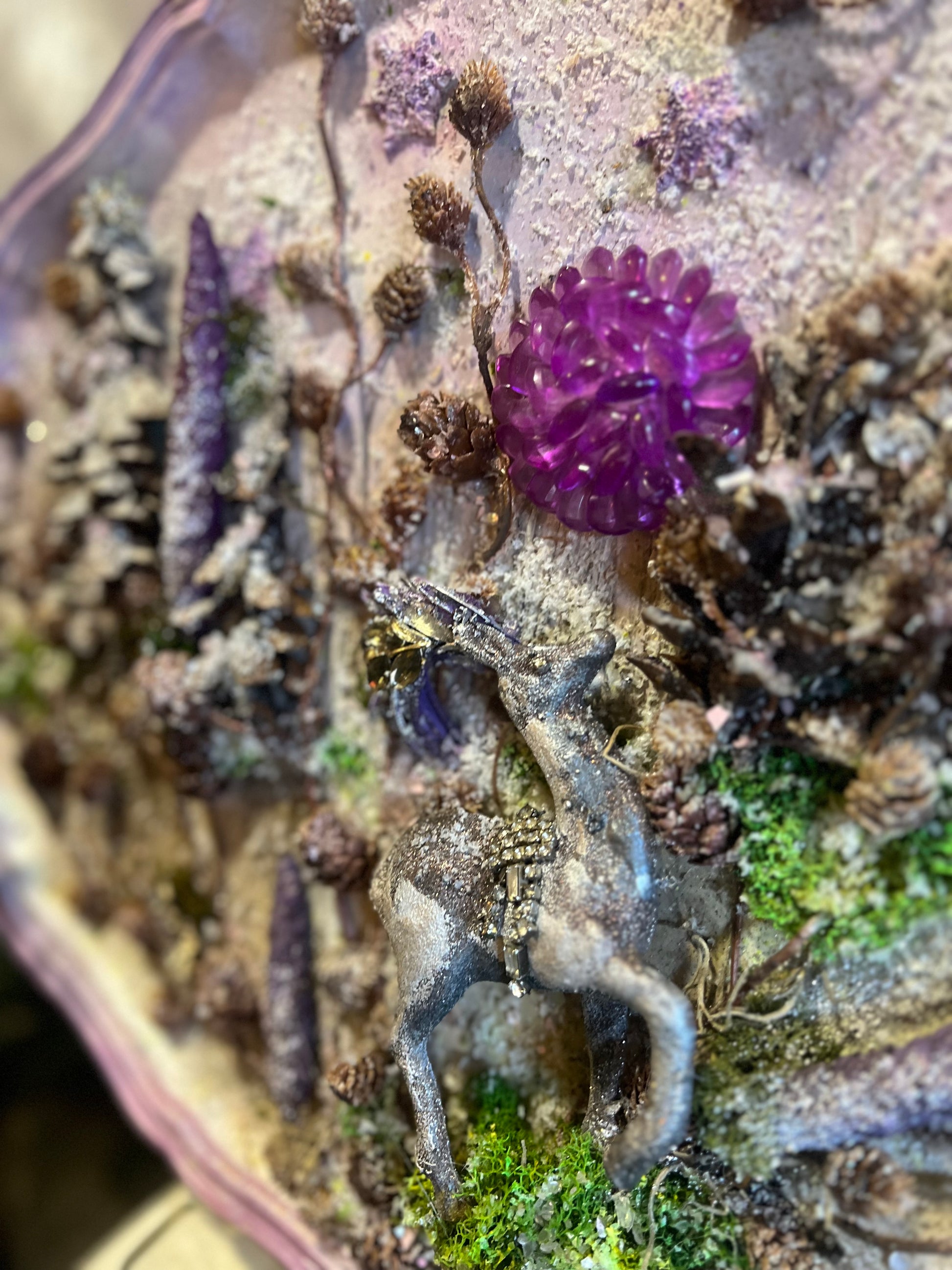 This vintage heavy silver plated tray was repurposed using texture to give that 3D design effect. Colorful shades of purples & glistening accents were added to this beautiful vintage tray. Bountiful of Pinecones, moss, and freshly fallen snow. Embellished with bold vintage pins that add to the uniqueness of this tray. One adorns the top of the tree, you can't miss the large purple lucite pin that lights up the tray, and vintage embellishments sits as a headdress of antlers on the dashing reindeer. This one of kind piece of art will add a touch of mother nature to the interior landscape of your home. This decorative tray can be placed anywhere in your home. This tray is accompanied by a vintage lucite picture frame holder for ease of placement. This tray can be hung on a wall for another option (backing not provided).