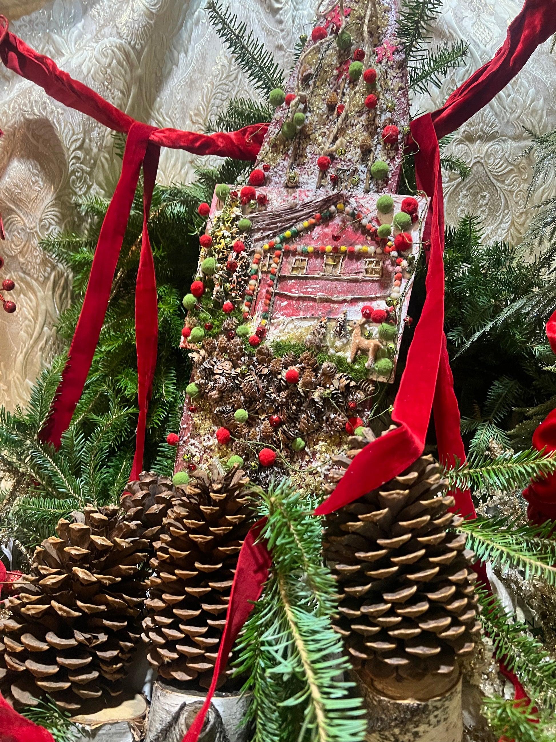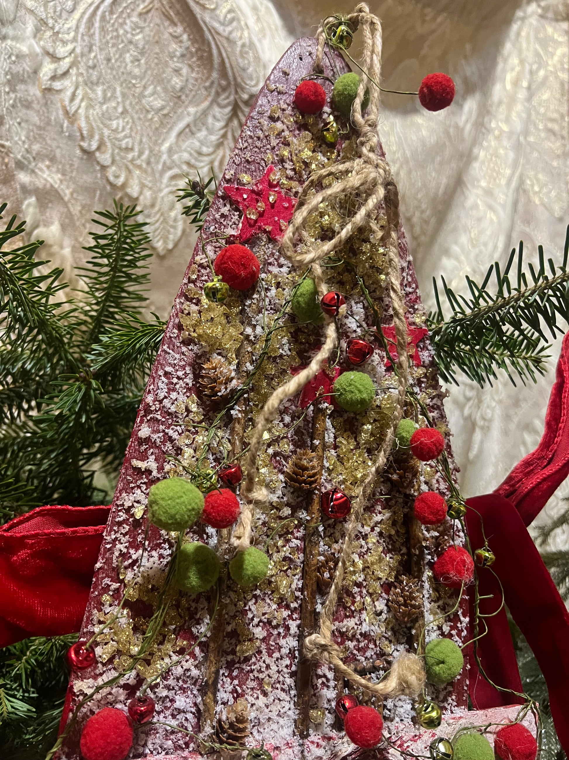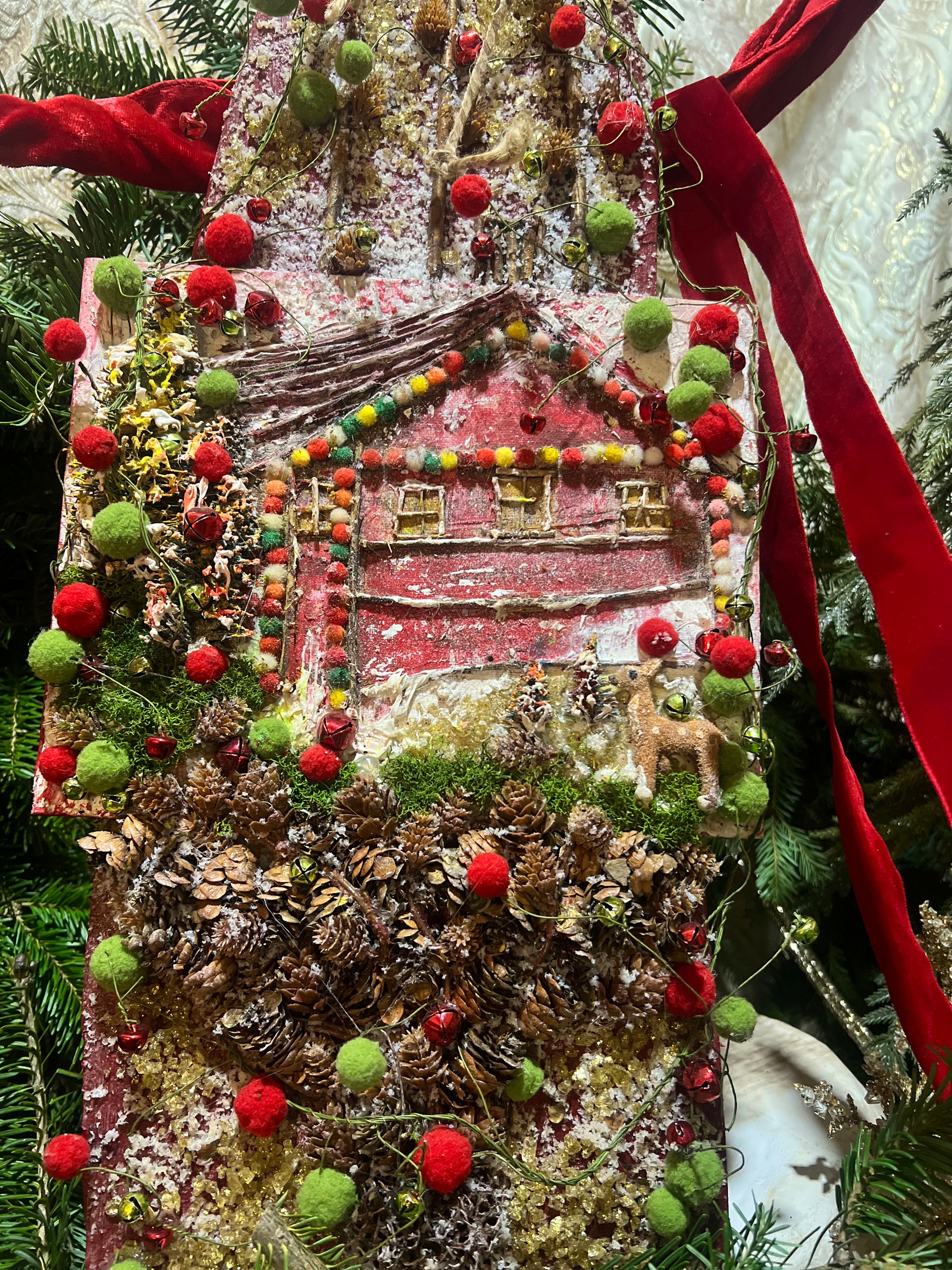 This merry & bright log cabin is a collaboration of our original artwork (on a canvas board) that captures a Boho style scene with raised accents that was attached to a repurposed vintage barn board. It will add a touch of mother nature to the interior landscape of your home. This vintage board was repurposed using texture and colorful garland to give that 3D design effect. The artwork depicts a colorful cabin nestled in the woods accented with gathered pinecones, moss, and freshly fallen snow with a sweet raised reindeer. This decorative board can be placed anywhere in your home or mounted upon fresh greens or a wreath. It is hung by natural roping for the ease of placement.