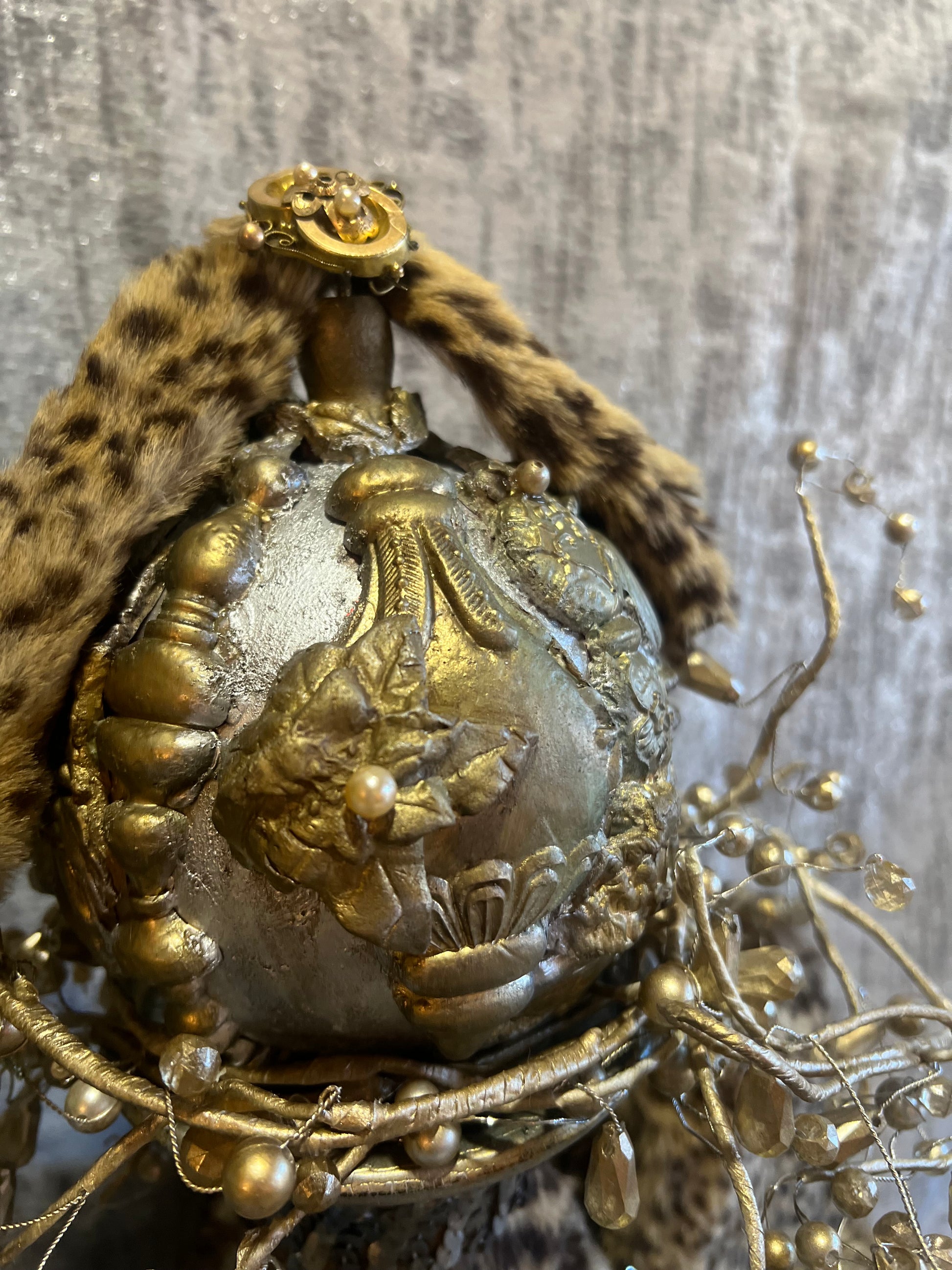 As the embellished ornament sits nestled on her throne, she is glorious ! Dripping with hues of tarnished gold and silver draping in pearls with embellishments of vintage leopard fur and metallic vintage beading for the finishing touch. This ornament has raised 3D texture for that added dimension, adorned with vintage pearls from our many years of collecting. The vintage leopard fur topper sits freely on the top and clips with a vintage pin. Embrace the love of vintage this holiday season with this one of a kind piece of art. This ornament can be used as a table setting or mantel piece accent as well as be removed from the stand for other decorative ideas. Please read item description on the size, this is an oversized holiday décor ornament that makes a Bold Statement. *** please note this ornament comes with the leopard stand only and a sparkling pearl like roping.