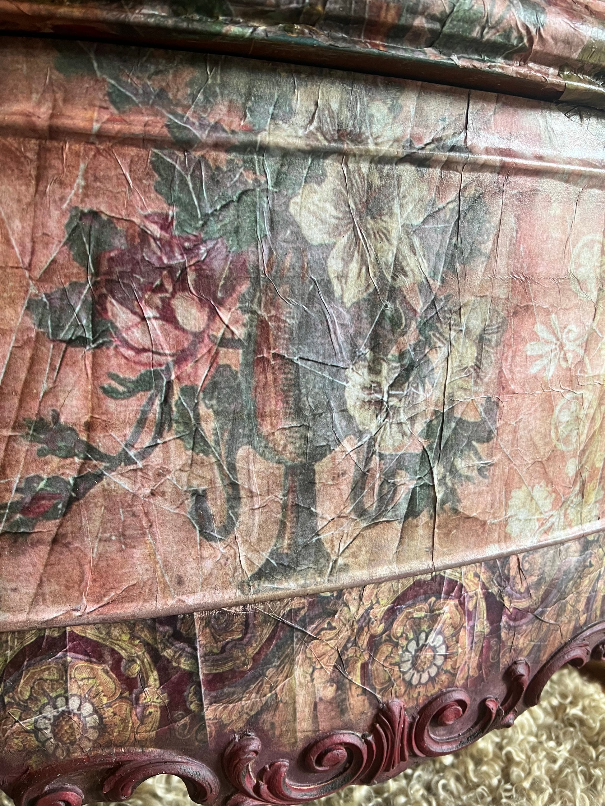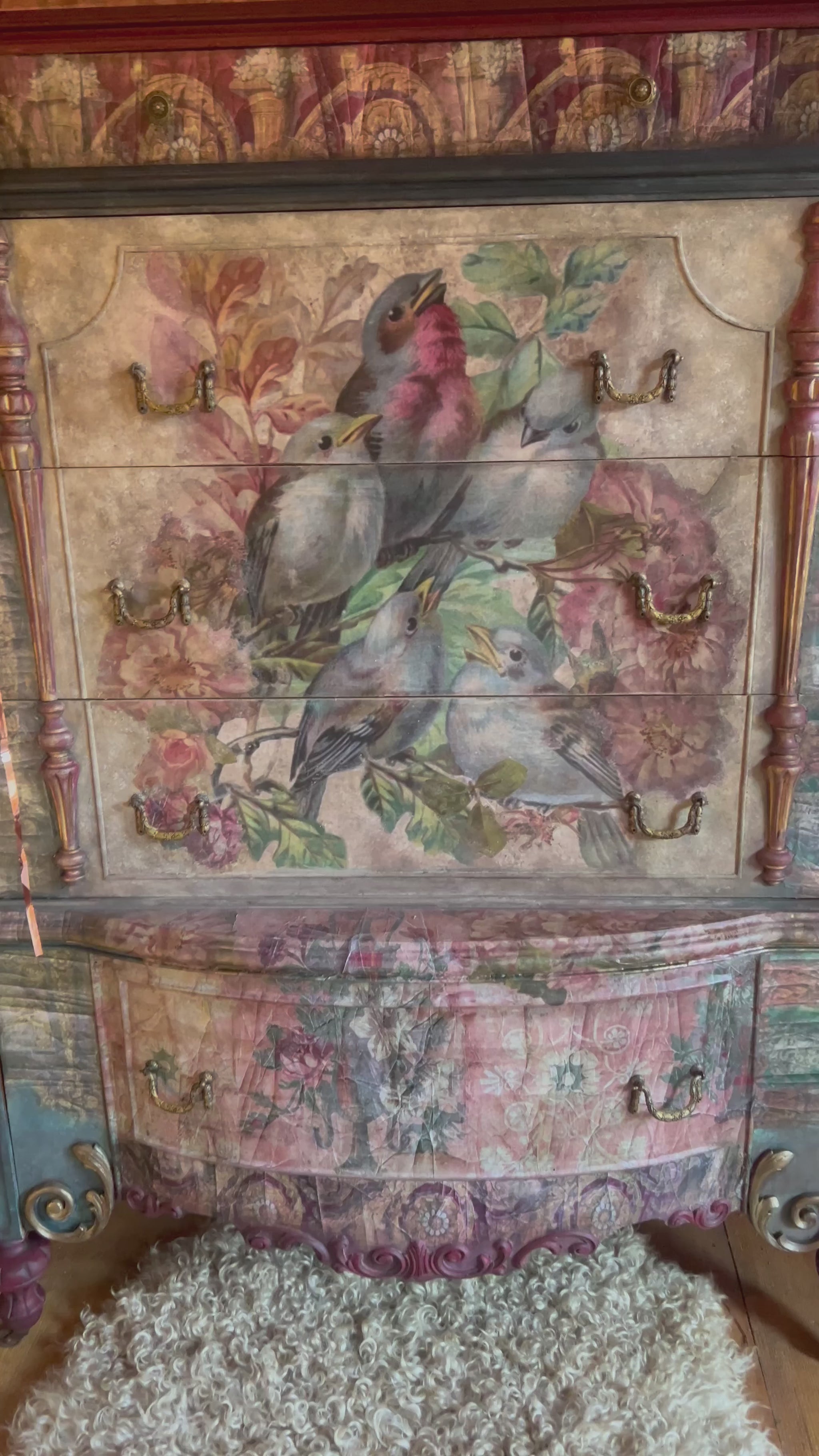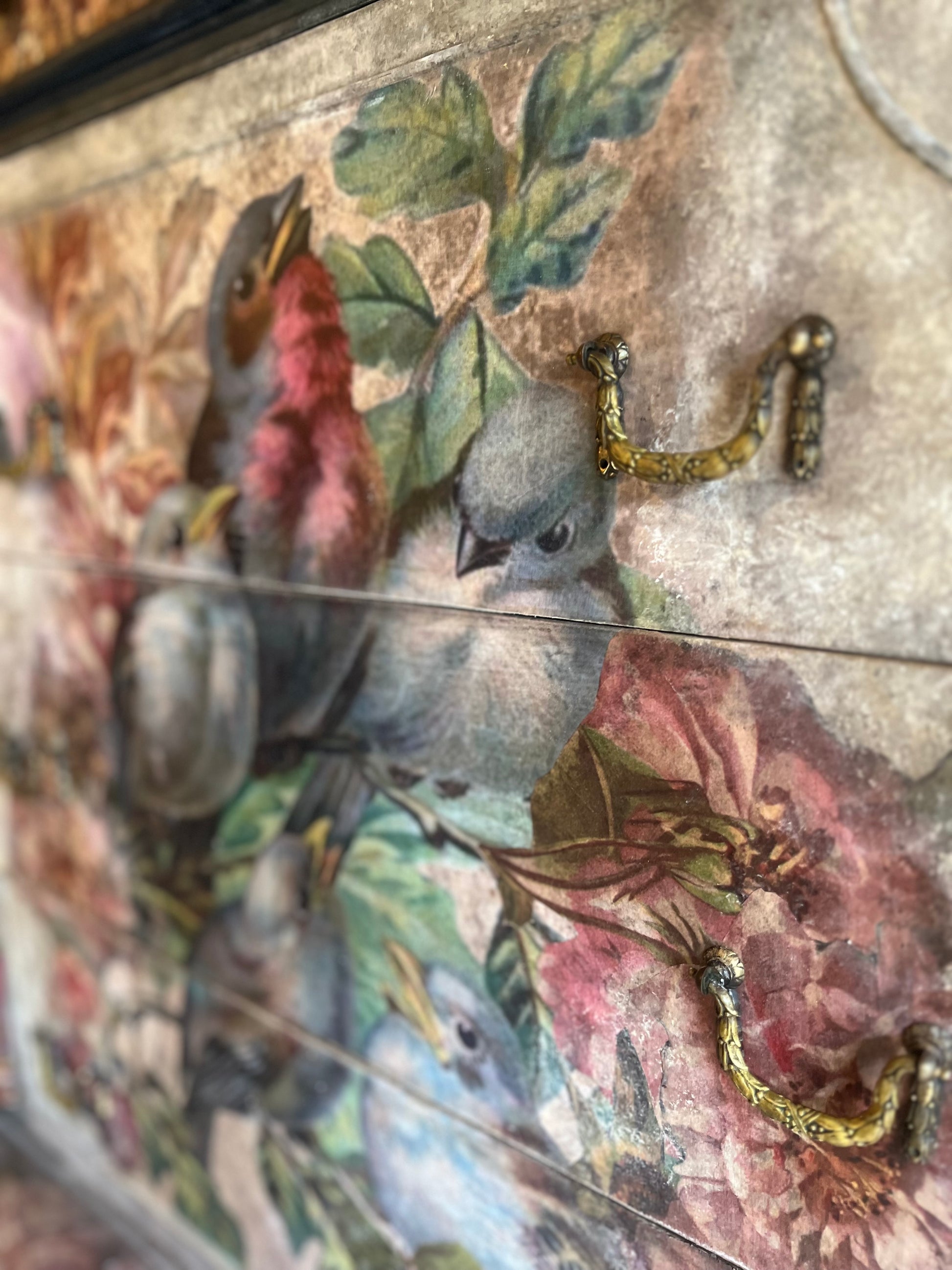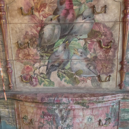 “Song Bird” was created with our exclusive vintage inspired decoupage papers by Dare To Be Vintage. The front captures the essence of nature complimented with some of our wonderful rustic aged papers along with vintage floral paper accents to really lend itself to a very unique style. This piece can range from a boho artsy feel to a real French country look. This piece was hand painted in areas to tie it all together and make this a true one of kind piece of art. We captured this gorgeous piece with a time worn feel. Beautiful original brass hardware.