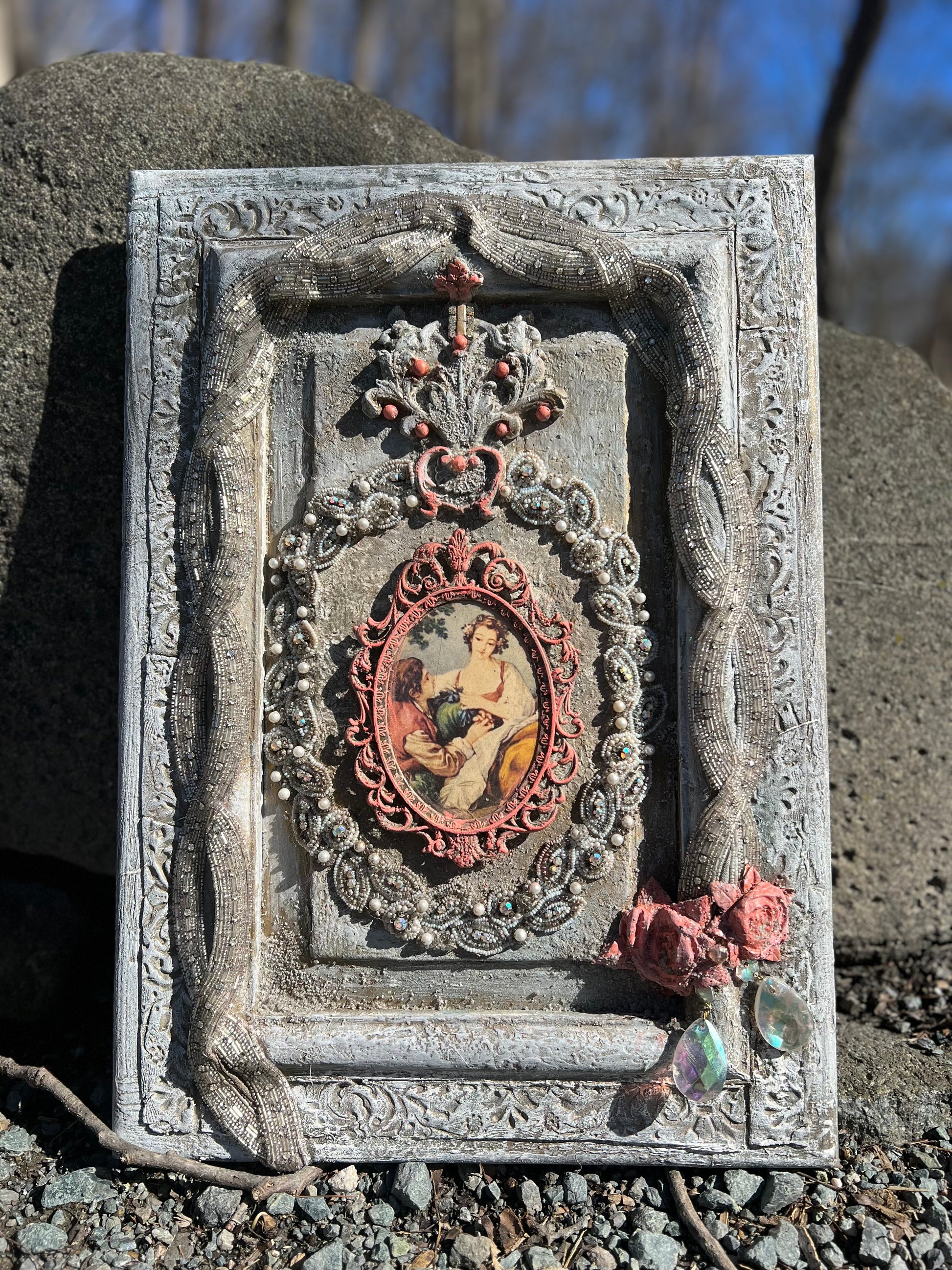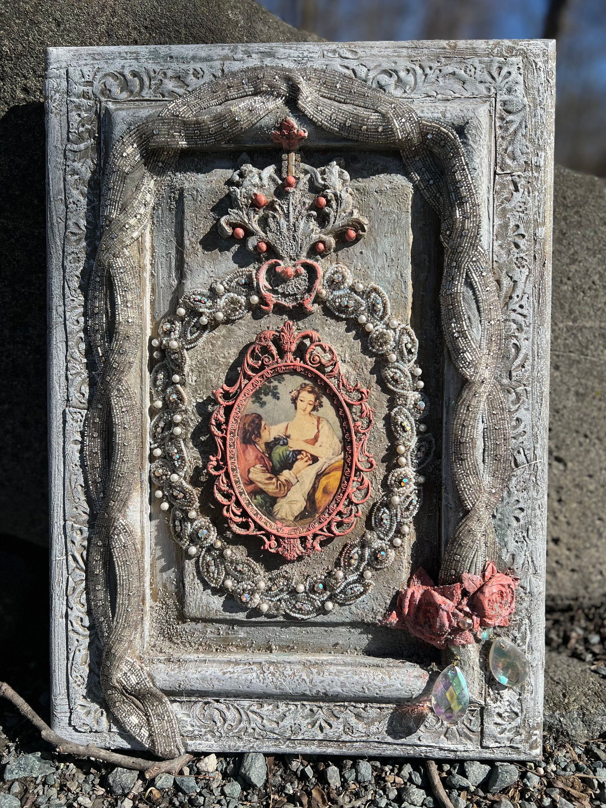 Wall art uniquely designed in our studio at Dare To Be Vintage. This piece was created using an old door that was originally taken from a vintage buffet and then the vision came to life. She is surrounded by vintage glistening jewels to evoke old world charm. Hues of tarnished silver with coral/pink accents for that pop of color. Bring old world charm into your home for that one of a kind touch.